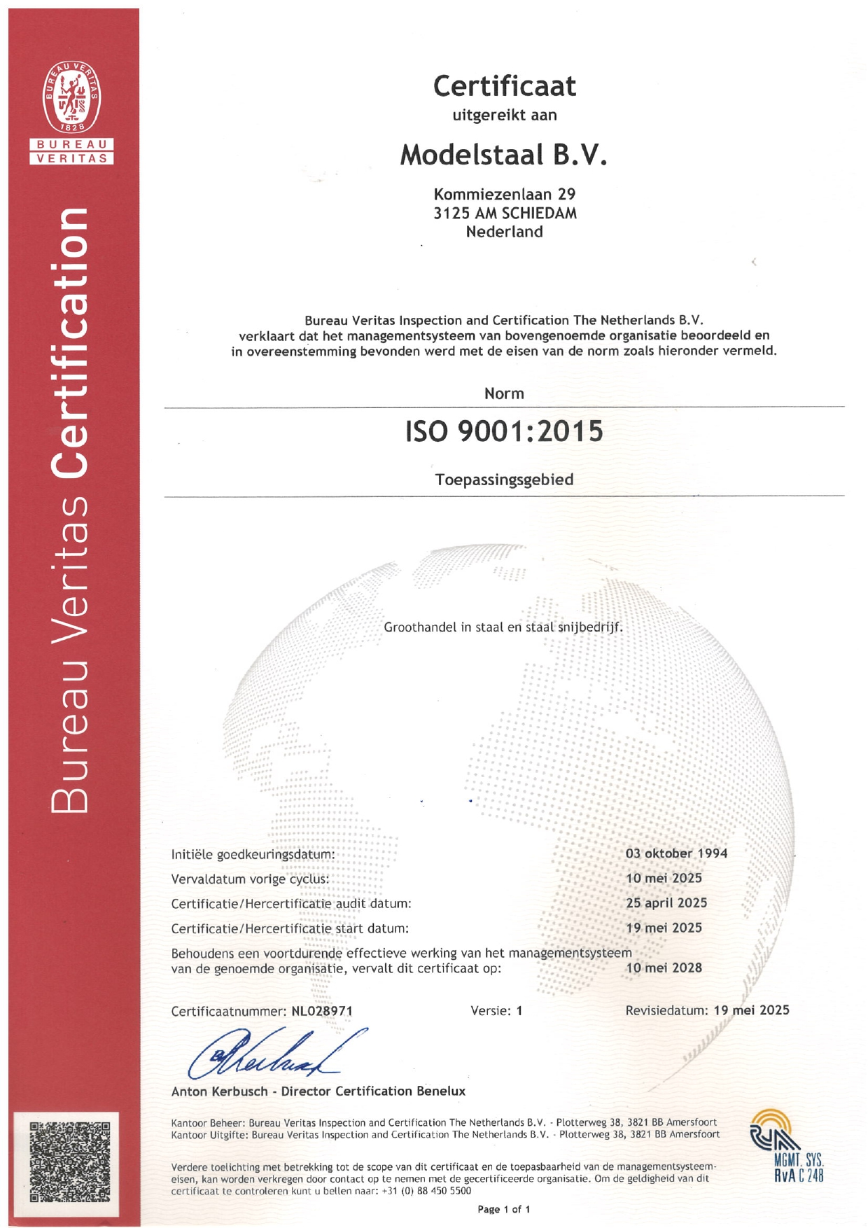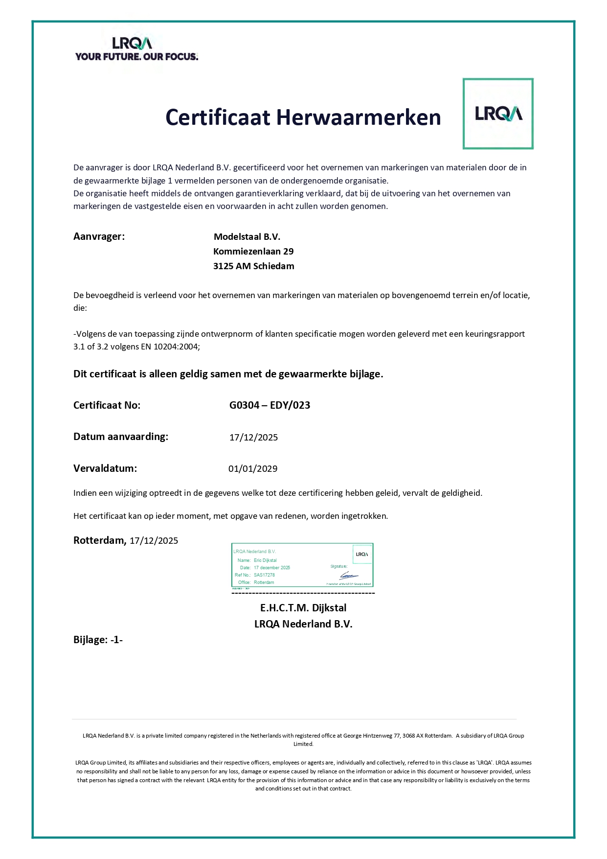 Door overstempelingsbevoegdheid van LRQA is Modelstaal in staat om ook hogere kwaliteiten gestempeld aan de klant te leveren. Daarnaast beschikt Modelstaal over het ISO 9001 kwaliteitscertificaat. En ook hebben wij er in 2015 de NEN 1090-1 aan toe kunnen voegen.